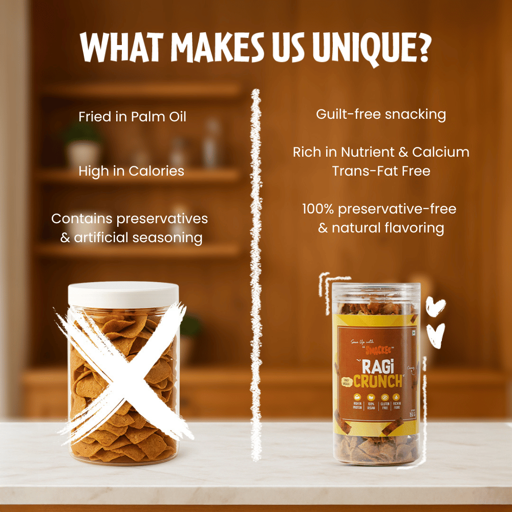 Ragi Crunch is your go-to snack when you crave something crunchy that’s bold on flavor and better than your regular chips. Made with the super grain nachni, which is rich in calcium, iron, and fiber. These chips are light and bring you that guilt-free snacking moment we all secretly wish for. It giives that satisfying crunch with just the right amount of desi seasoning to keep your taste buds happy. Perfect for tea time, office breaks, or midnight munching.