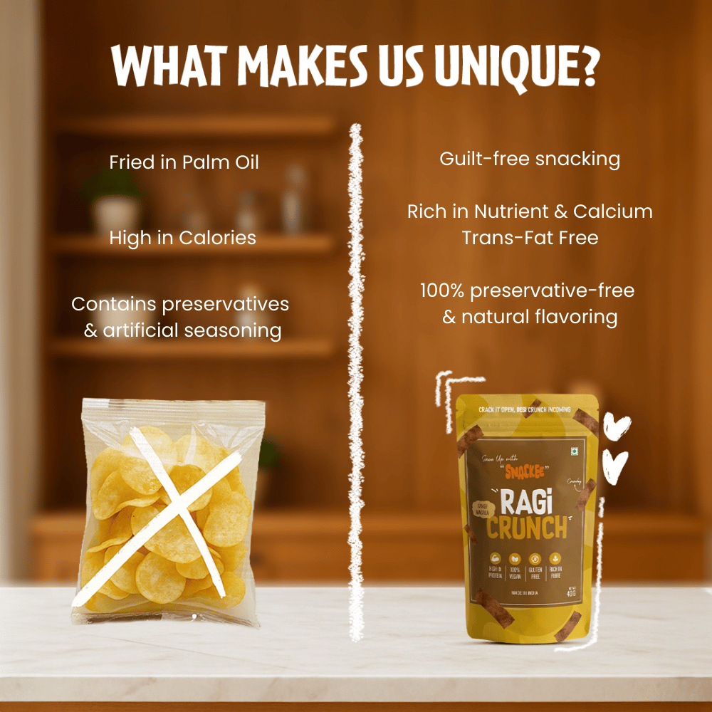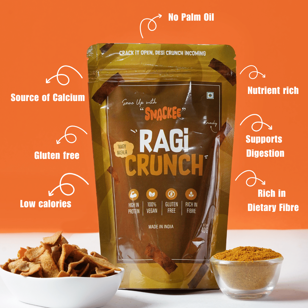 Ragi Crunch is your go-to snack when you crave something crunchy that’s bold on flavor and better than your regular chips. Made with the super grain nachni, which is rich in calcium, iron, and fiber. These chips are light and bring you that guilt-free snacking moment we all secretly wish for. It giives that satisfying crunch with just the right amount of desi seasoning to keep your taste buds happy. Perfect for tea time, office breaks, or midnight munching.