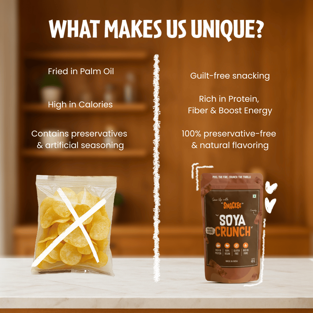 Soya Crunch is the answer to your "I want something tasty and filling" days. It is made from high-protein soya flour, lightly spiced to give you that chatpata Indian masala feel. With a crisp texture, light, crunchy, and full of flavor, this is your 4 PM hunger’s worst enemy or during Netflix marathons. With every crisp bite, you get the goodness of soyaa powerhouse of plant protein tossed in lip-smacking spices. t’s a great pick-me-up for in-between meals, travel snacks, or when you're just bored of bland food. Ek baar try kiya, toh packet khatam hone se pehle rukna mushkil.